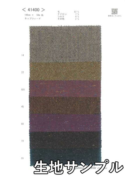 カラー14 ベージュMIX | 22 イエローMIX | 681 パープル/オレンジMIX | 45 オレンジMIX | 68 パープルMIX | 19 ブラウンMIX | 89 チャコールMIX混率ウール 87% / ナイロン 7% / シルク 4% / その他 2%有効巾148cmストレッチナシ特徴当社オリジナルの生地(産地直送)です。